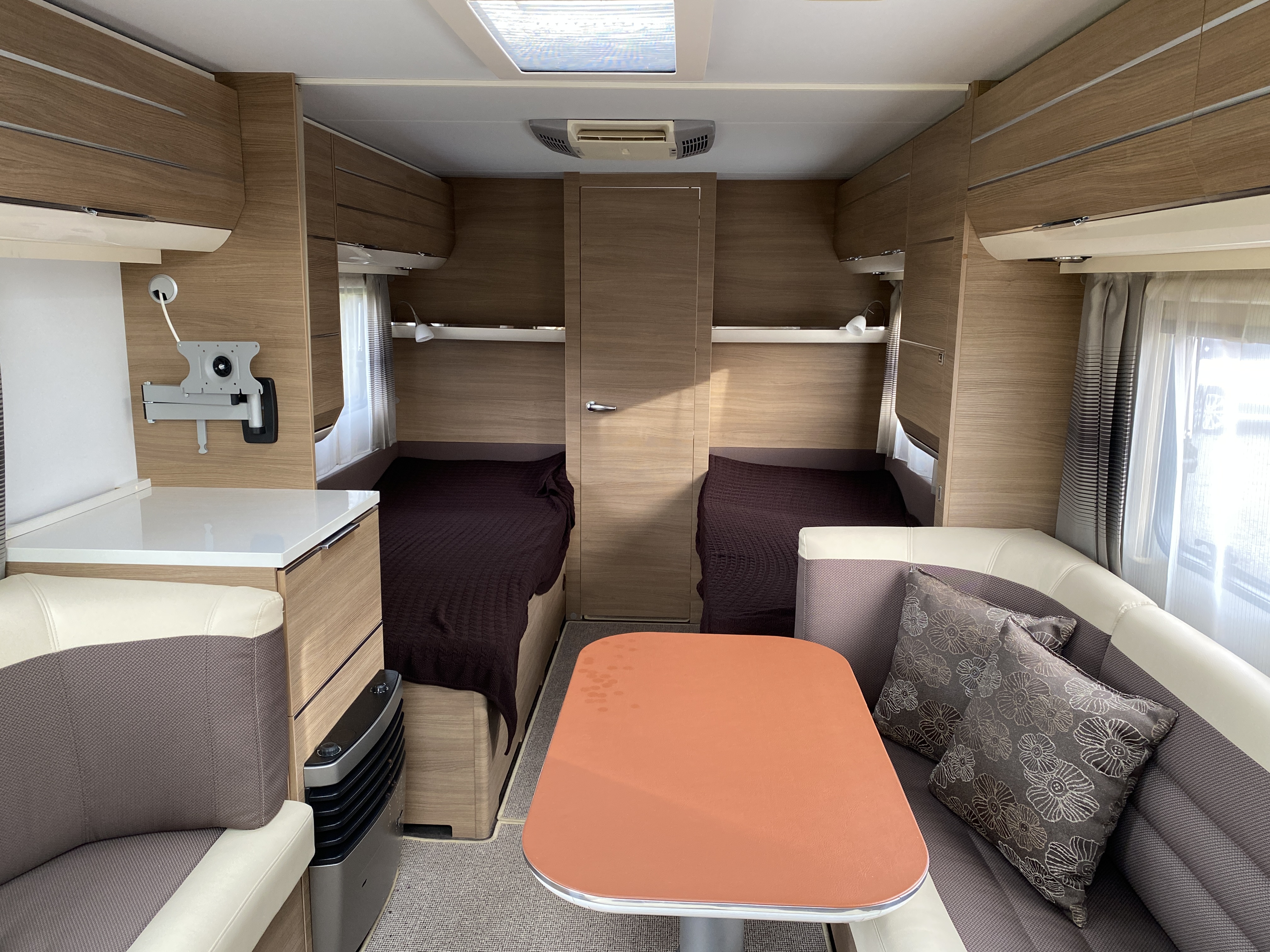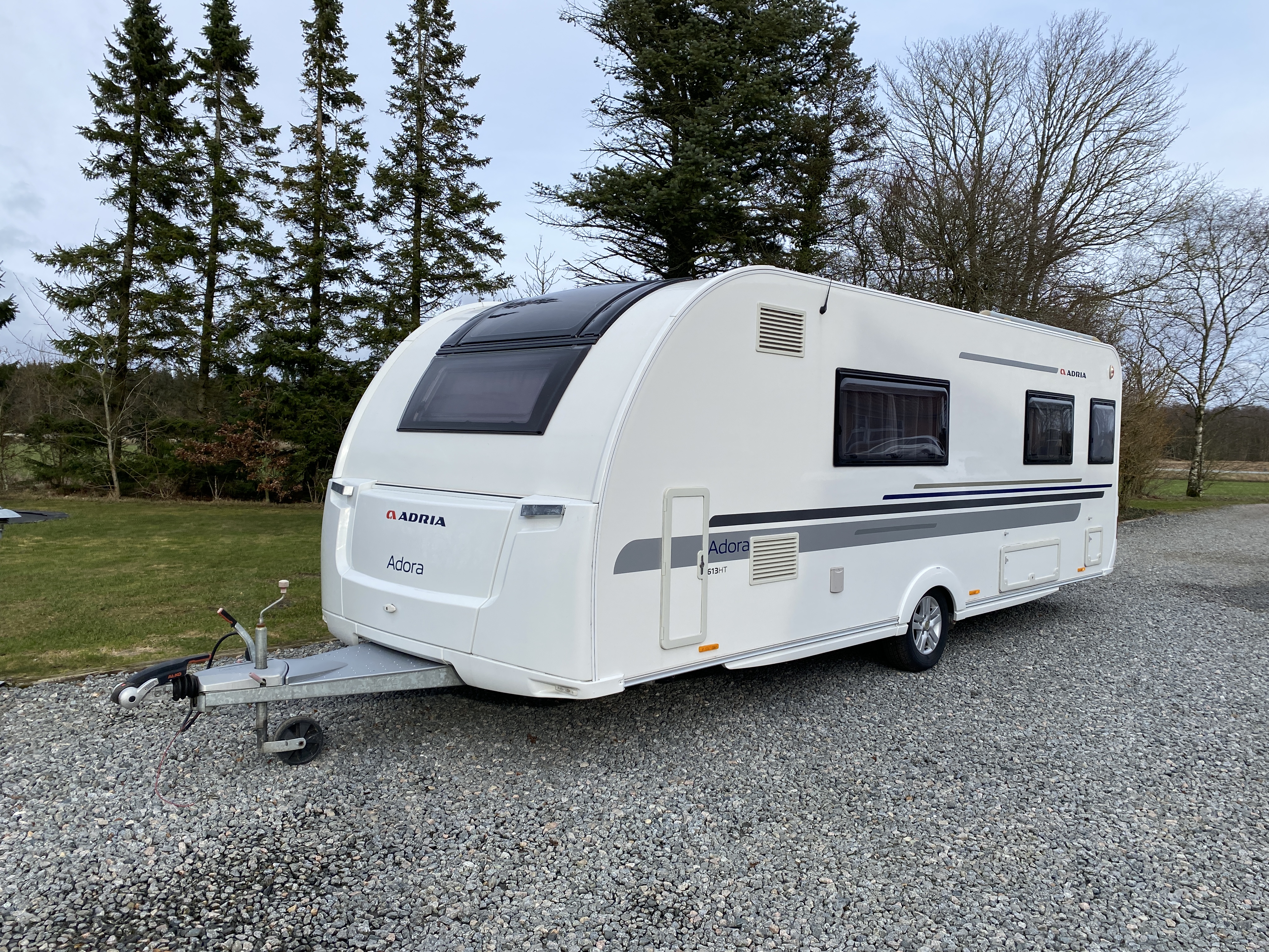 Her er en stor lækker velholdt vogn i den bedste kvalitet fra Adria, vognen har enkeltsenge i Midten af vognen, samt stort køkken med højt køleskab i forenden under panoramaruden.