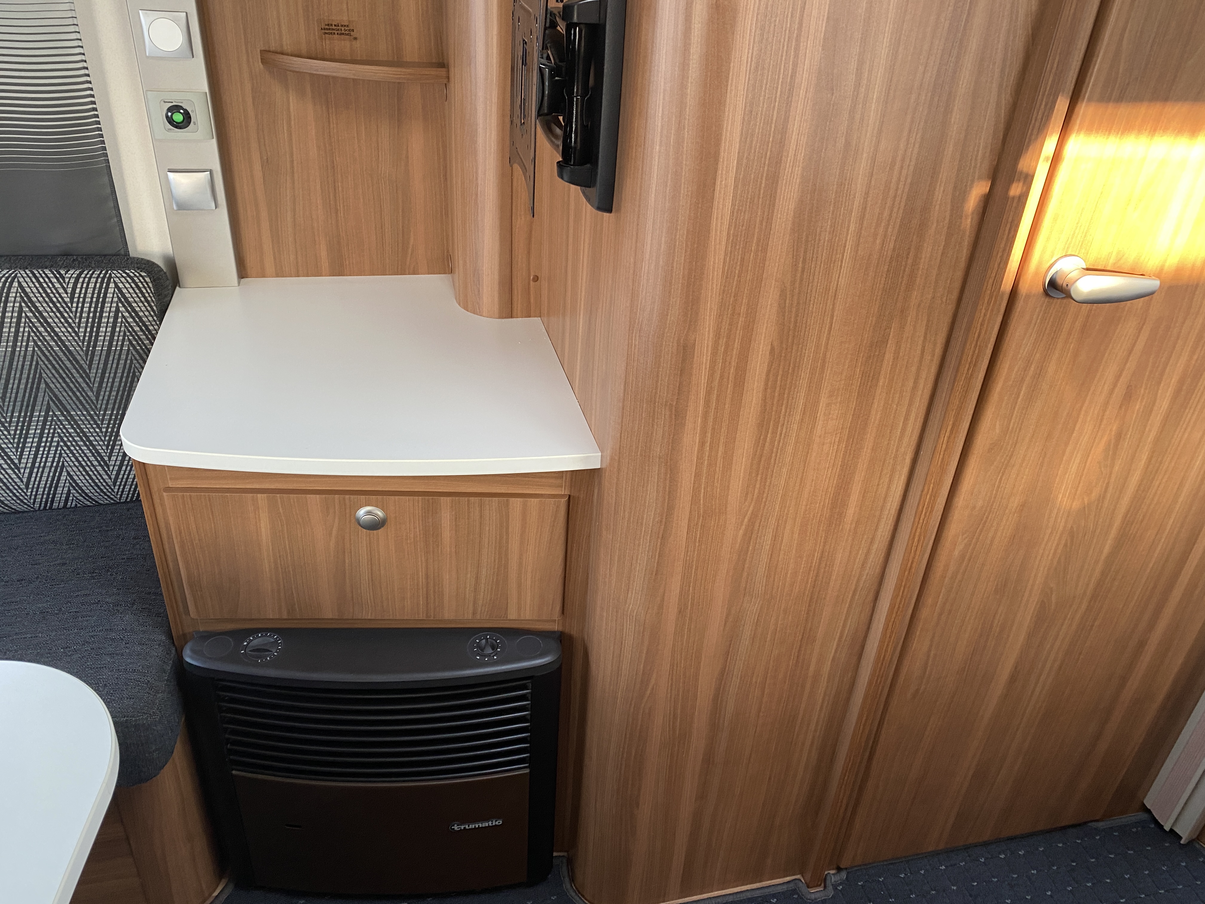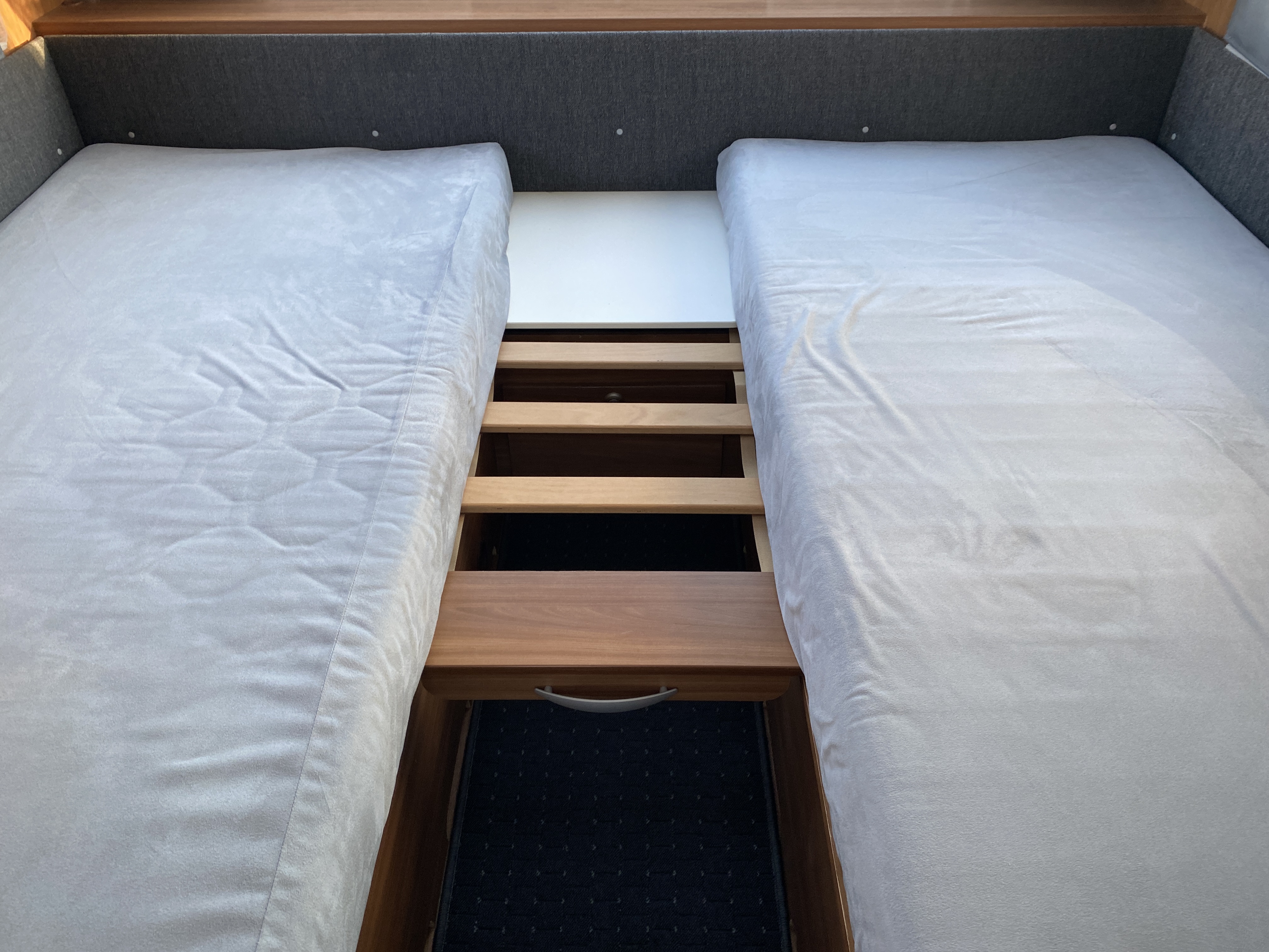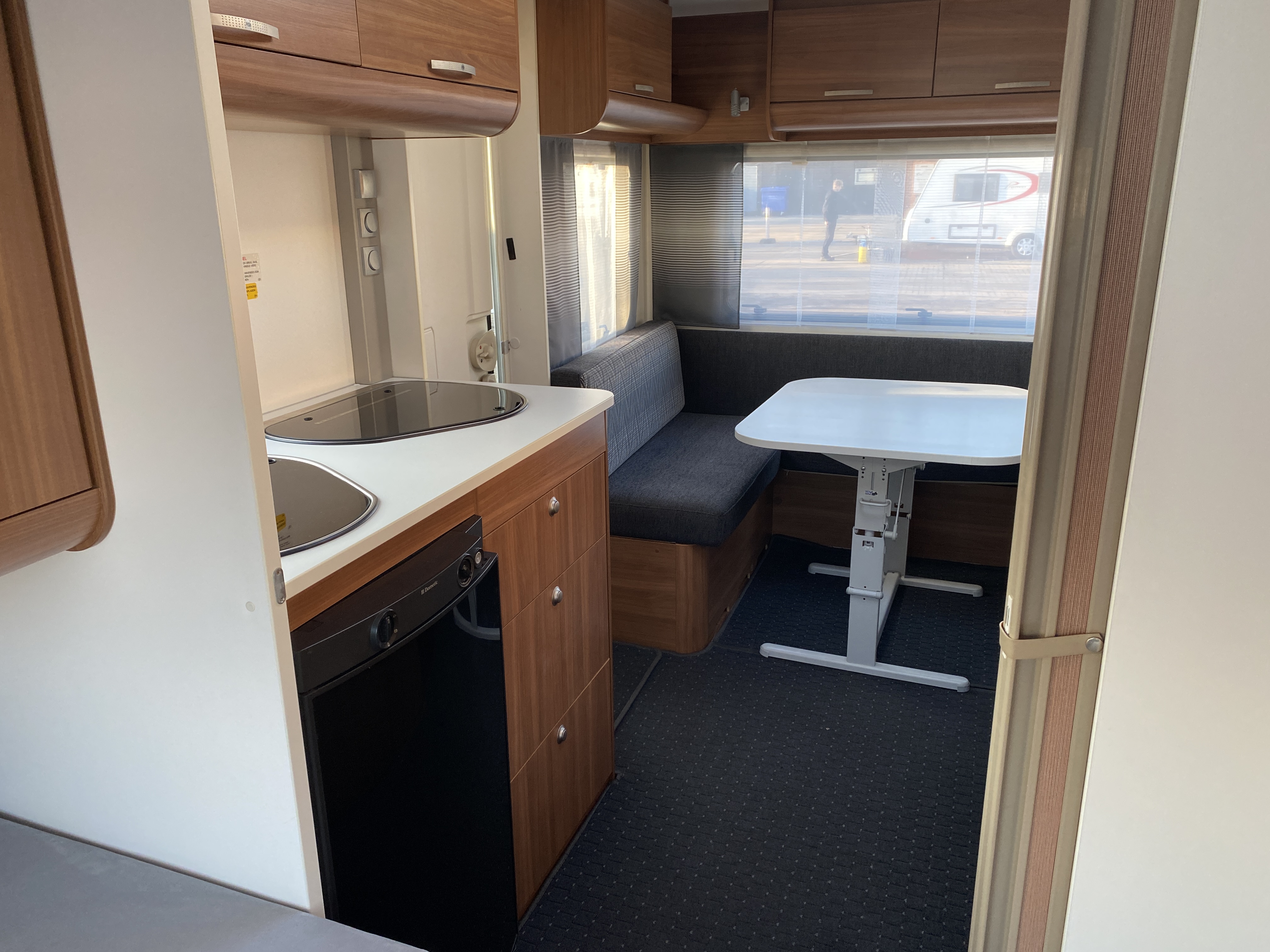 Vognen er indrettet med enkeltsenge m/lameludtræk, således at der nemt omdannes til en stor dobbeltseng og med siddegruppe bagerst i vognen, dejligt køkken overfor badeværelse i midten.