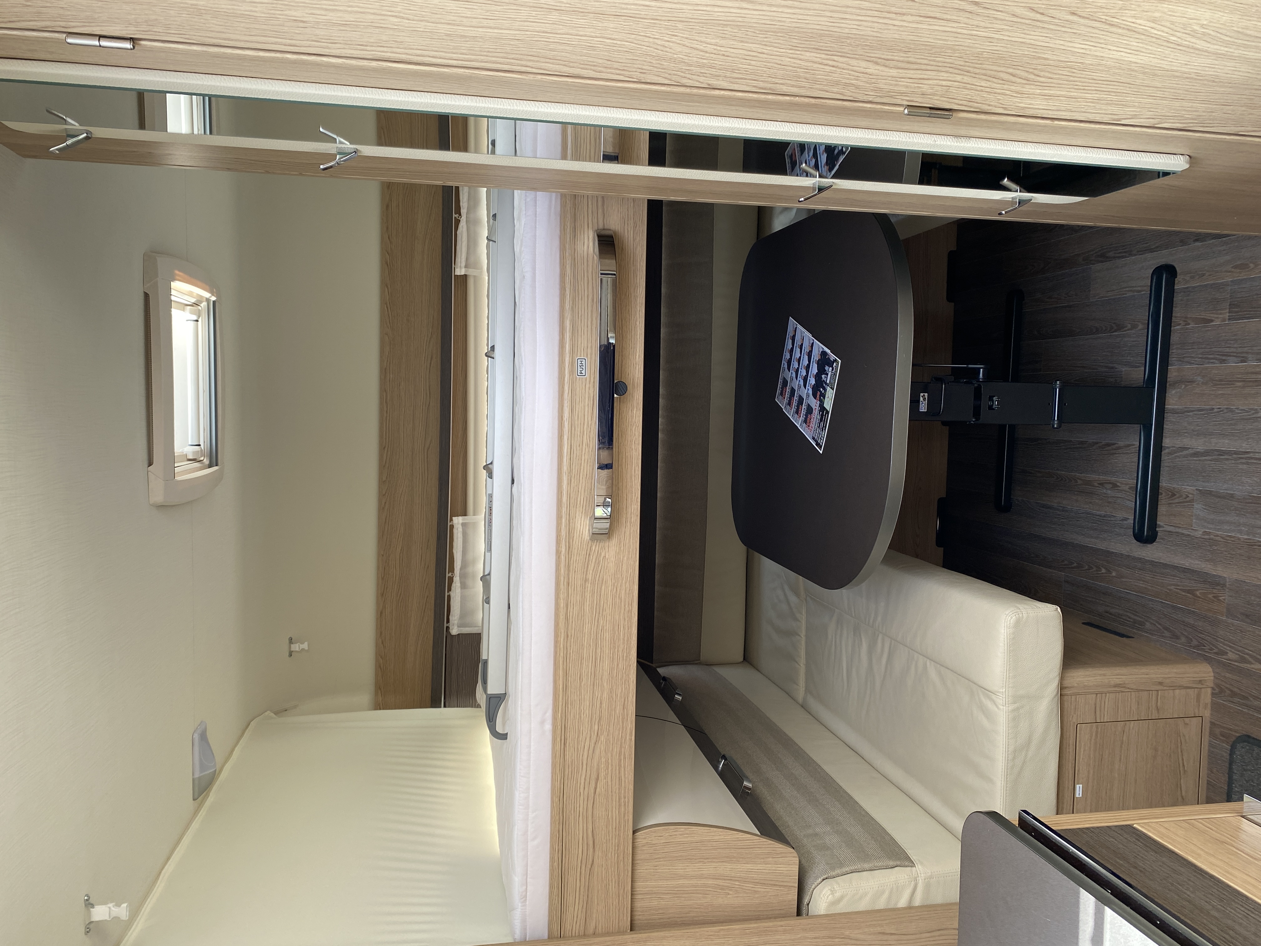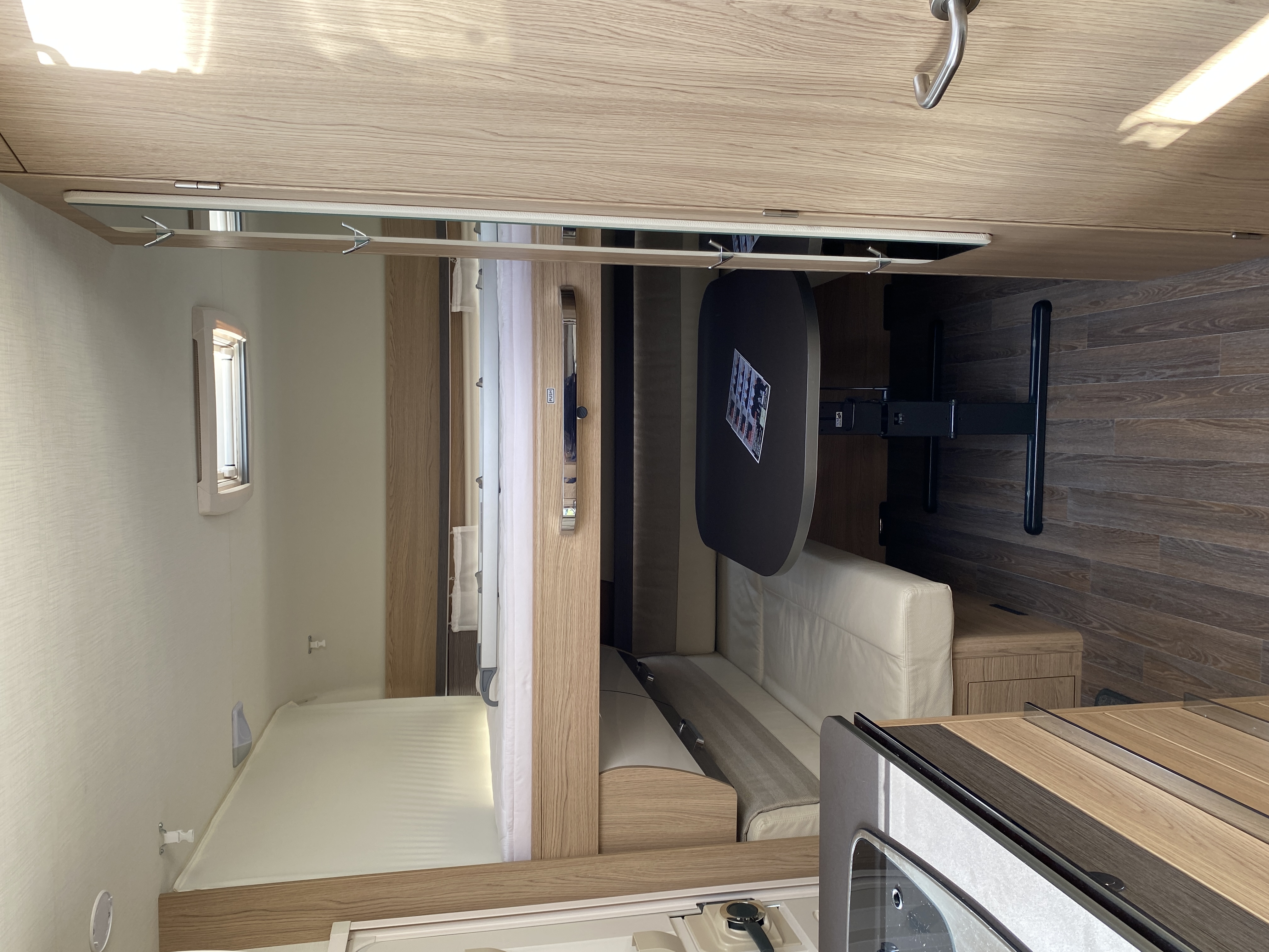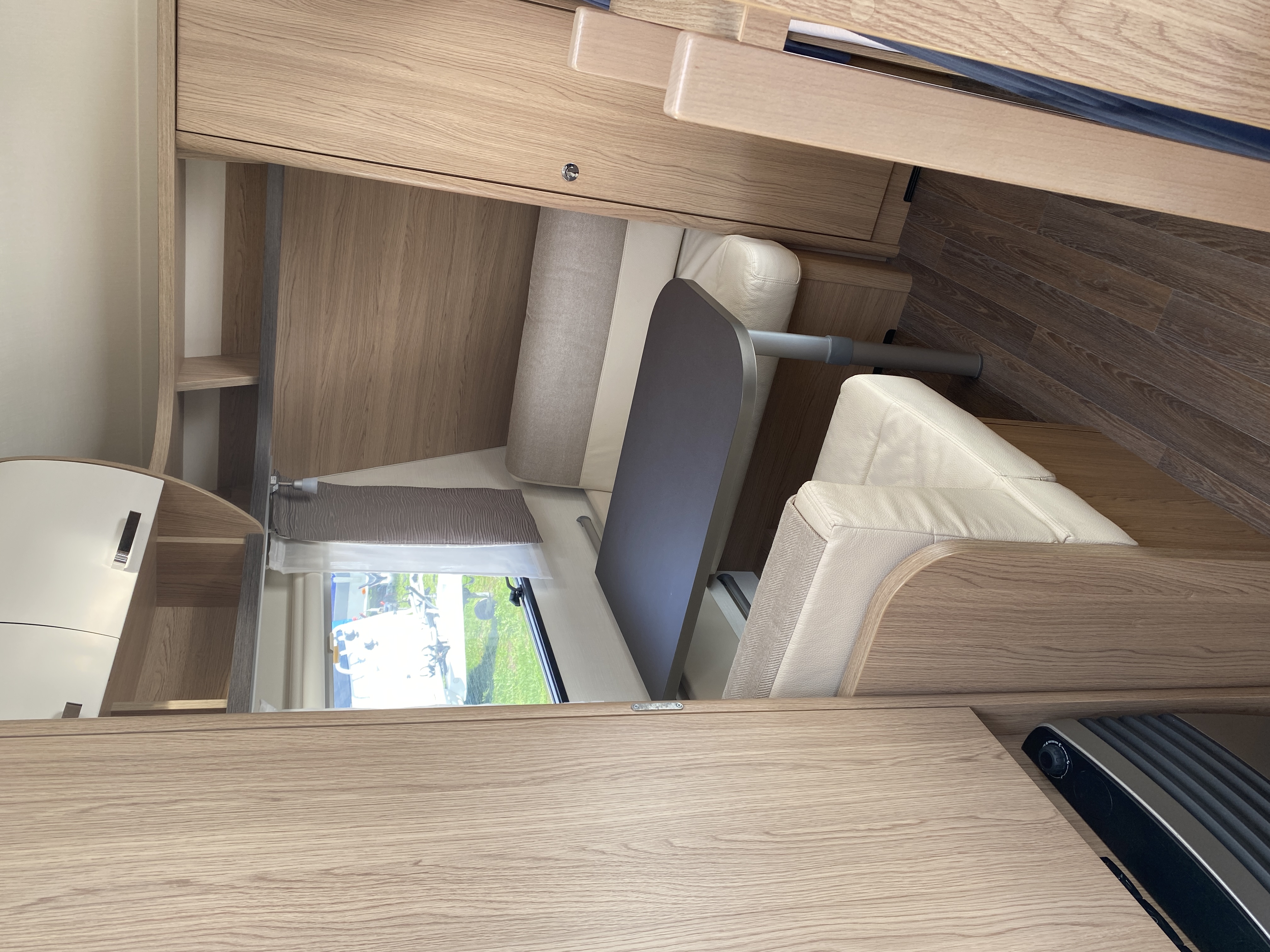 Flot vogn med Køjer samt lille siddegruppe der kan laves til soveplads i forenden. Rundsiddegruppe, hvor der også er hæve sænke seng over med dobbeltseng, i bagenden, midt i vognen er der toilet rum og køkken med stort køleskab, Truma gasovn, El gulvvarme , Der medfølger Isabella fortelt, vognen sælges gastestet, synet og med forhandler garanti. kan Evt nedvejes efter behov.