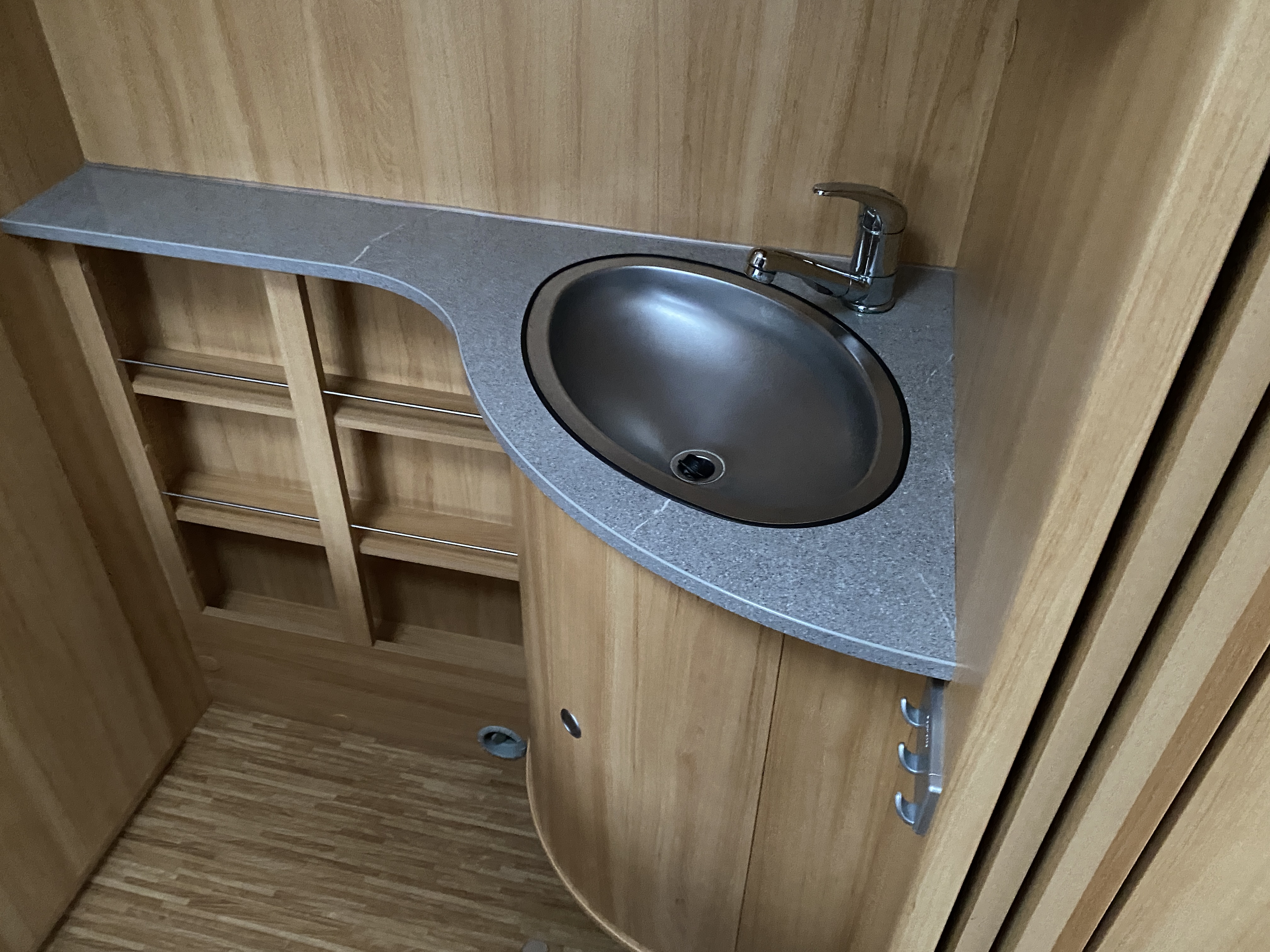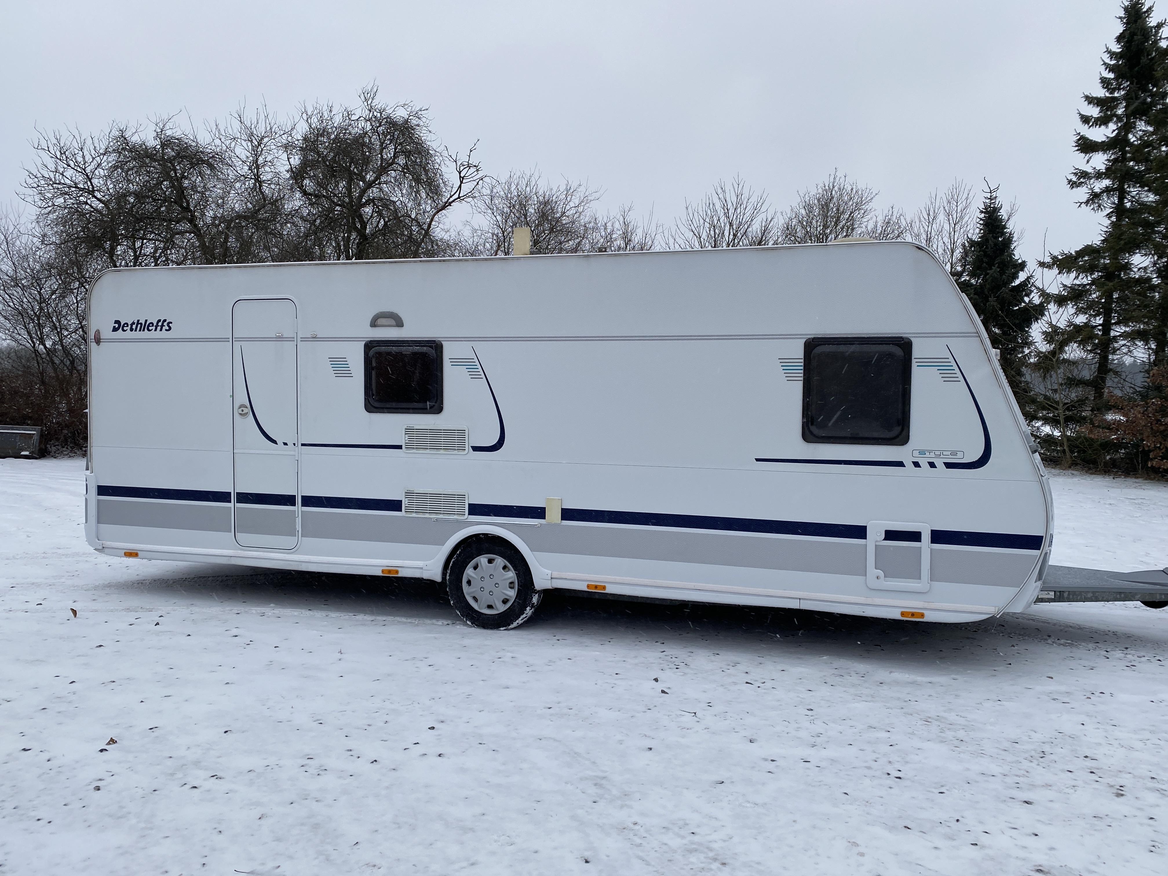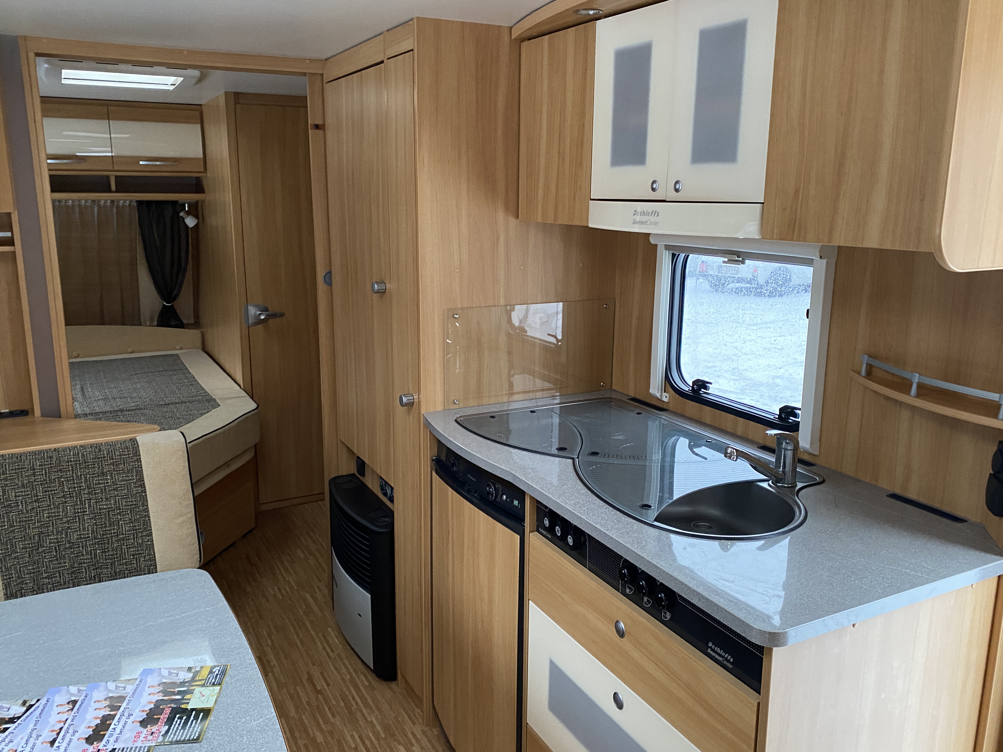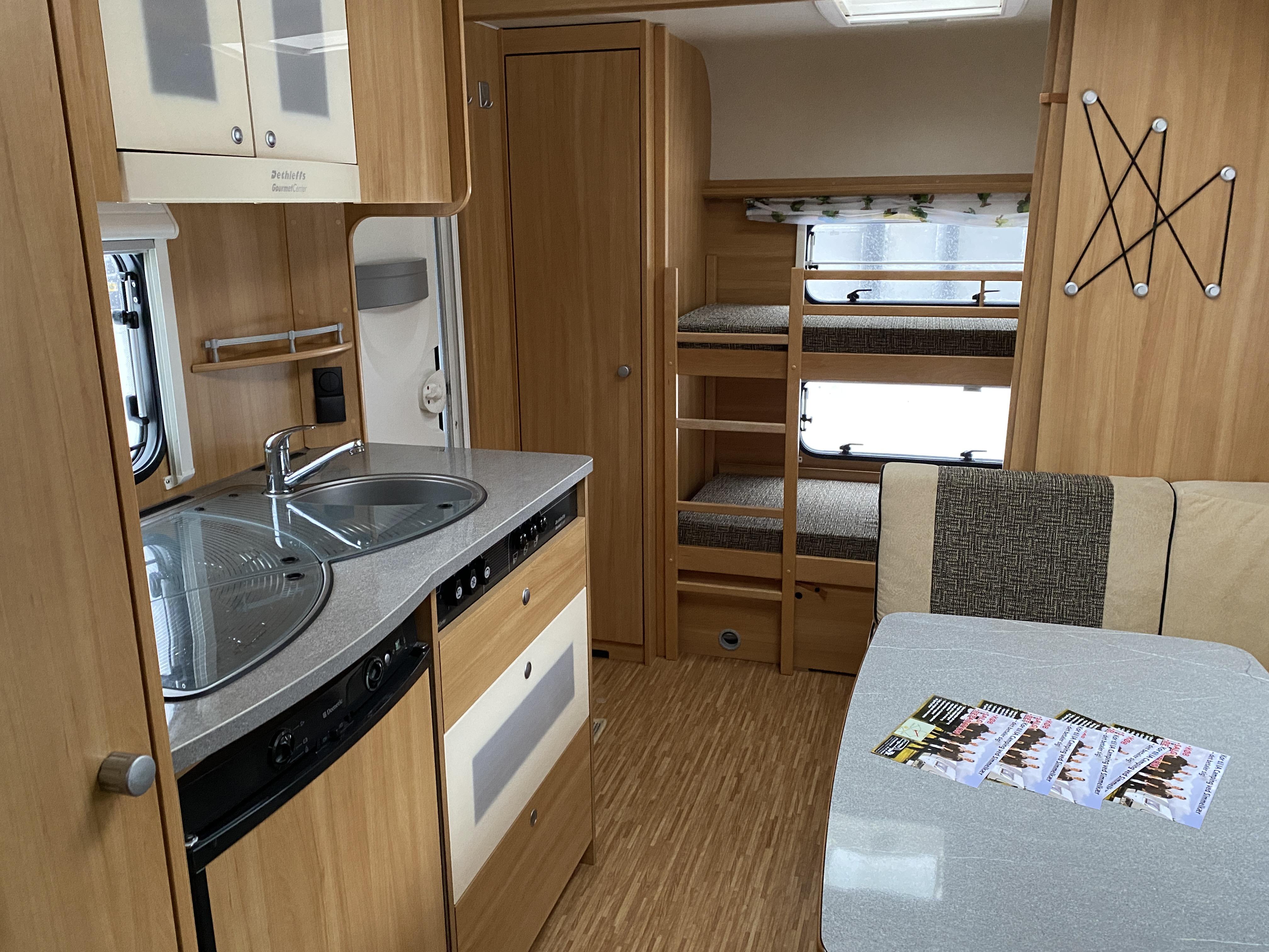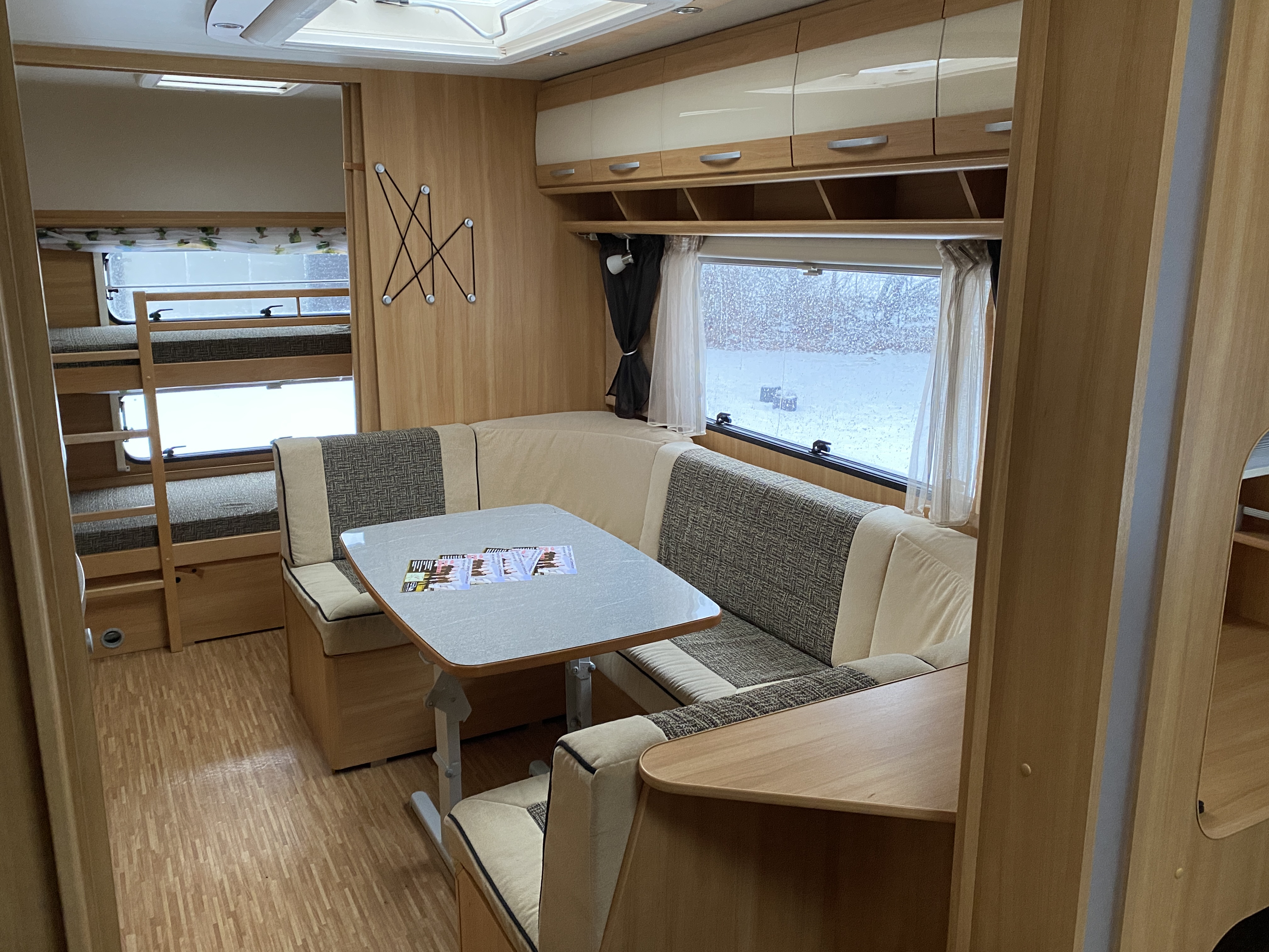 En lækker køjevogn med fransk seng og toilet rum i front. Fin størrelse køkken og stor rundsiddegruppe i midten af vogn og 2 køjer i bagenden. Vognen sælges Inkl. standard monteret udstyr og fortelt. Vognen sælges Gastestet, synet og Inkl. forhandler garanti.