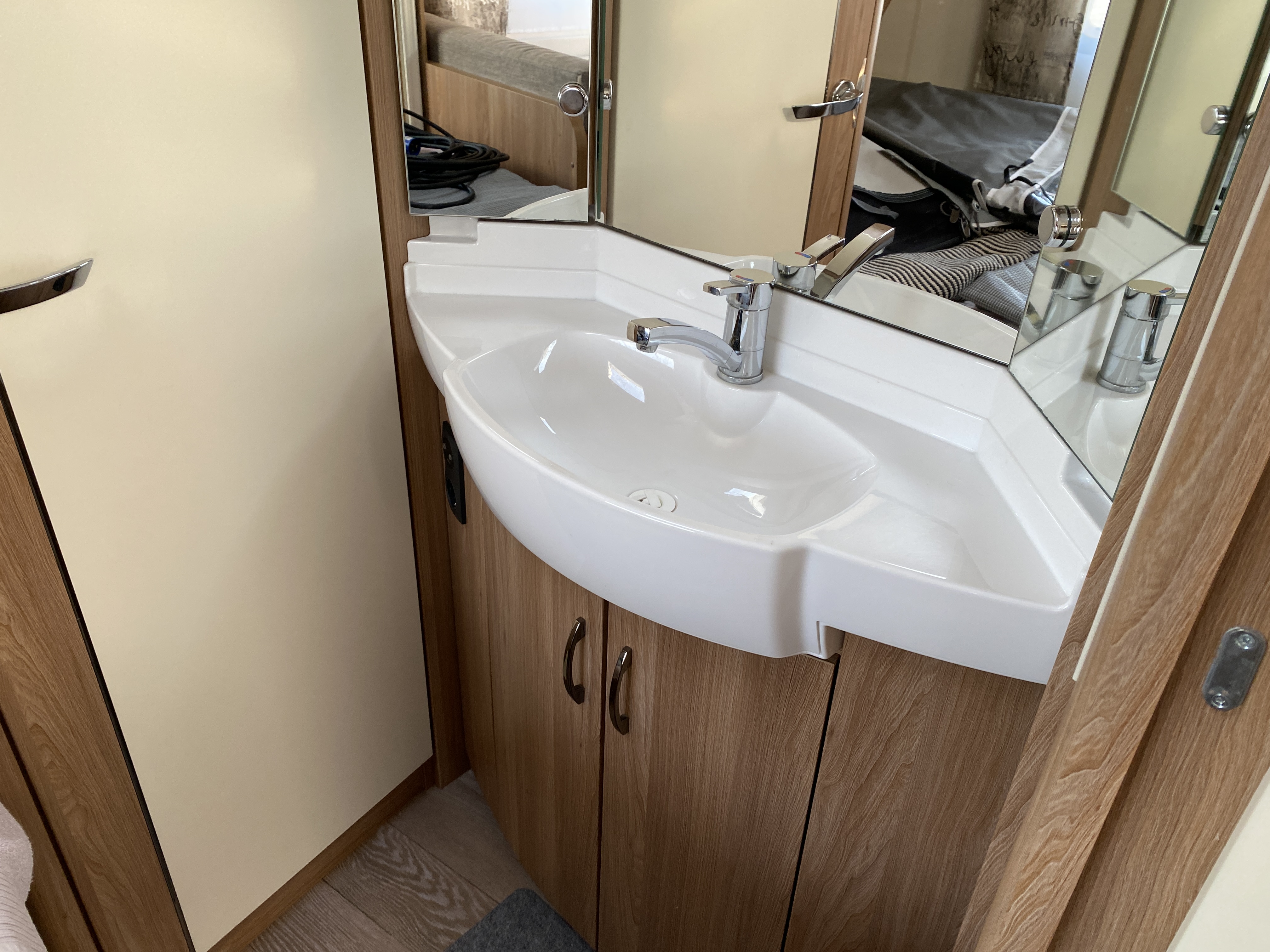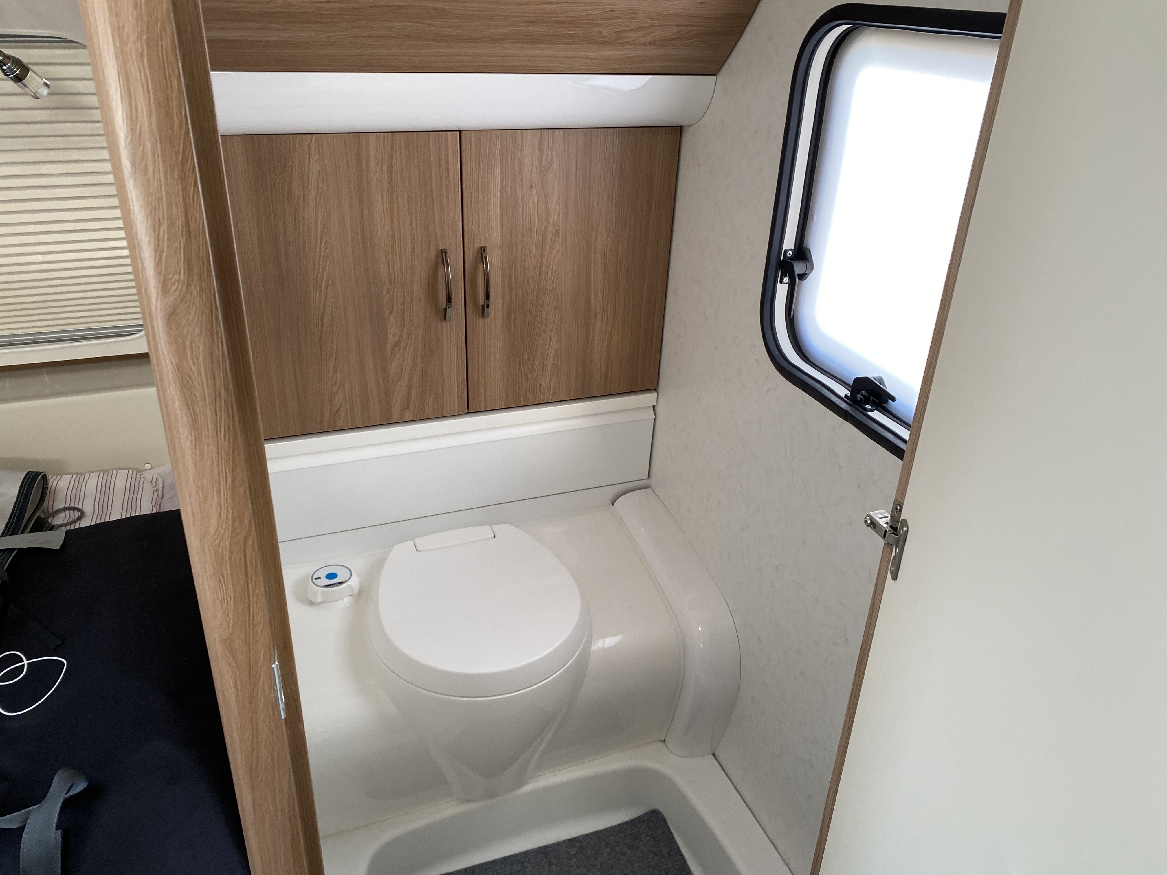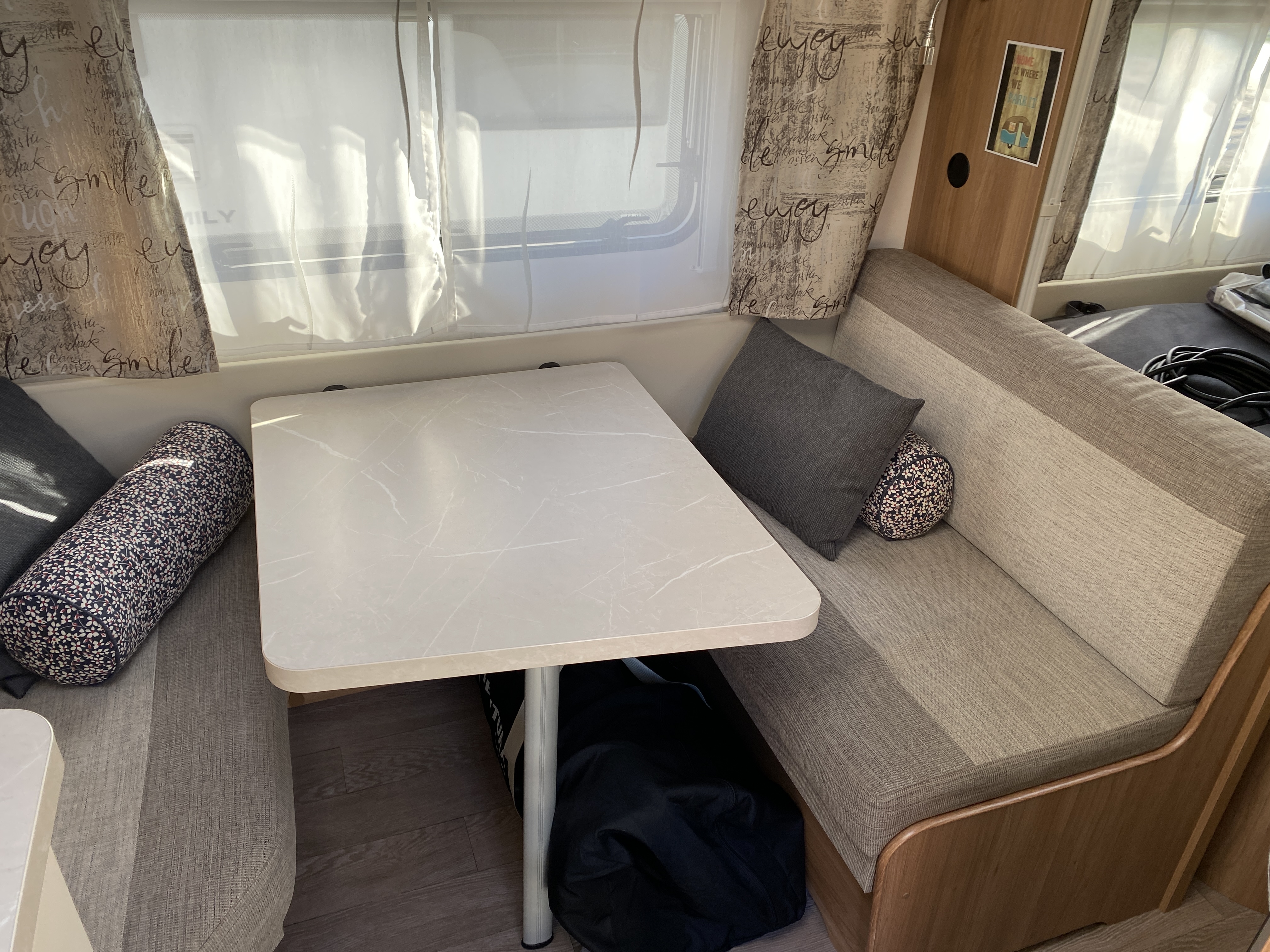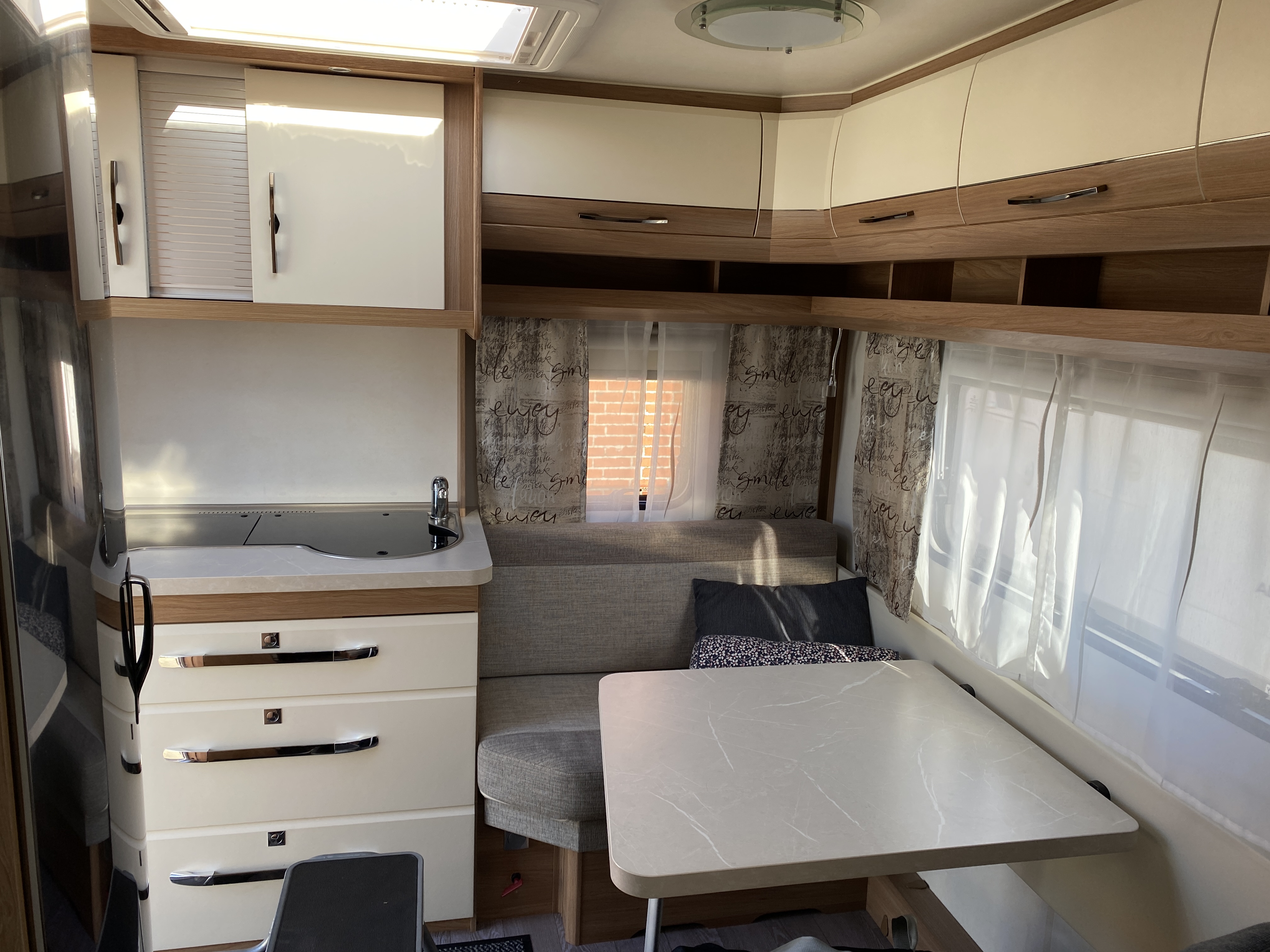 Fin lækker og velholdt vogn med Fransk seng og toilet i forenden og med siddegruppe og køkken bagerst i vognen, stor 1500kg aksel, Mover og fortelt.