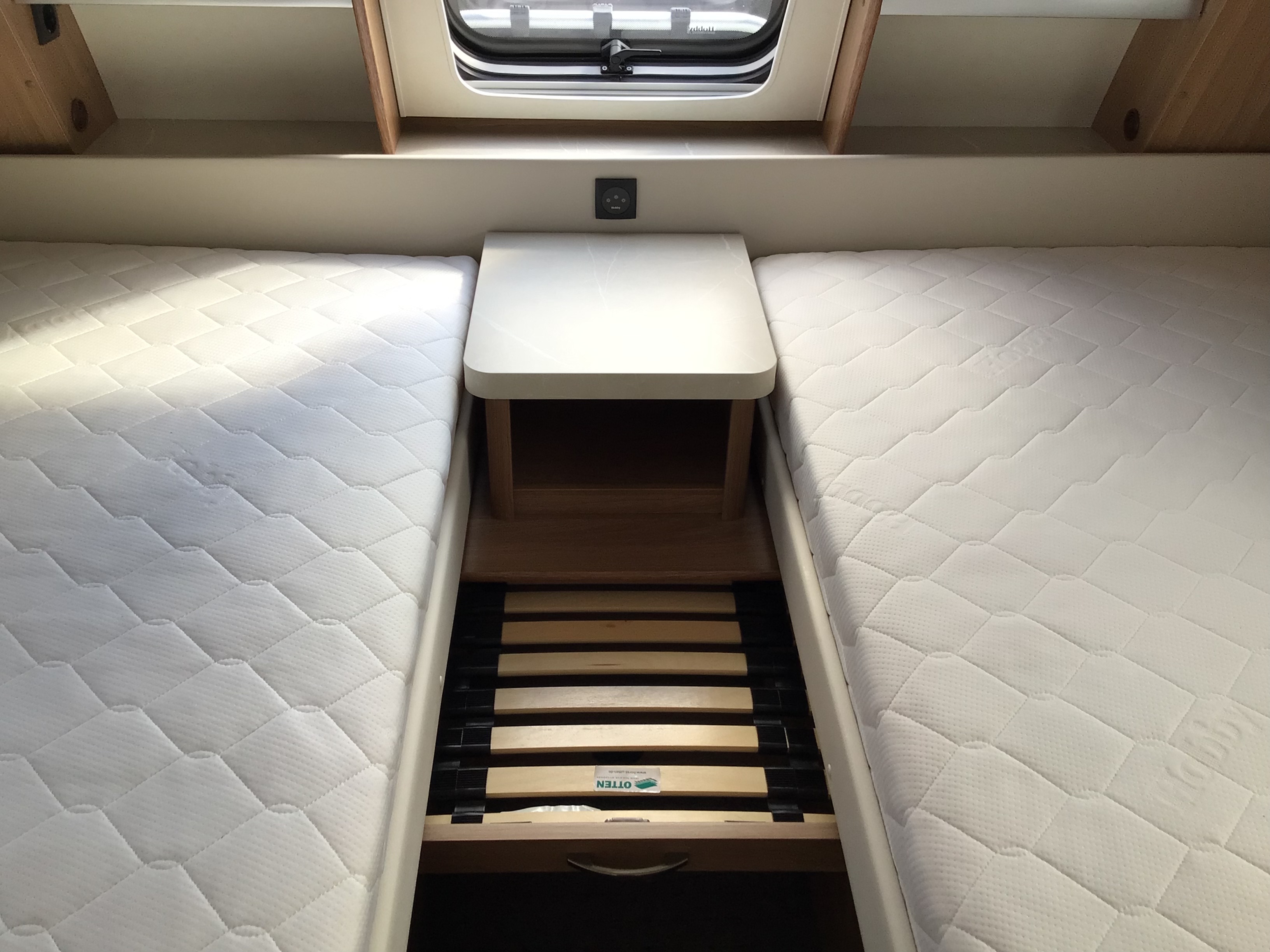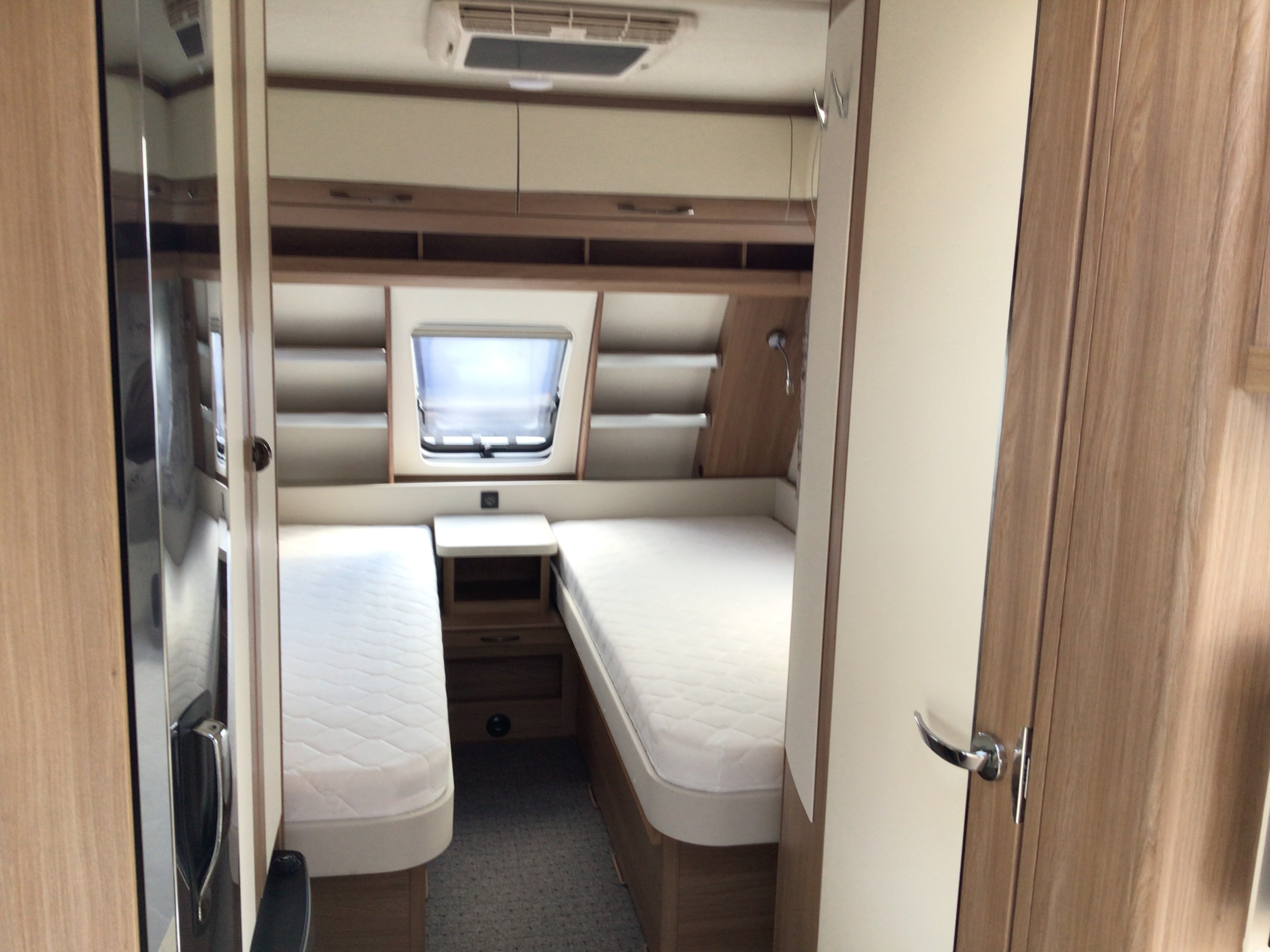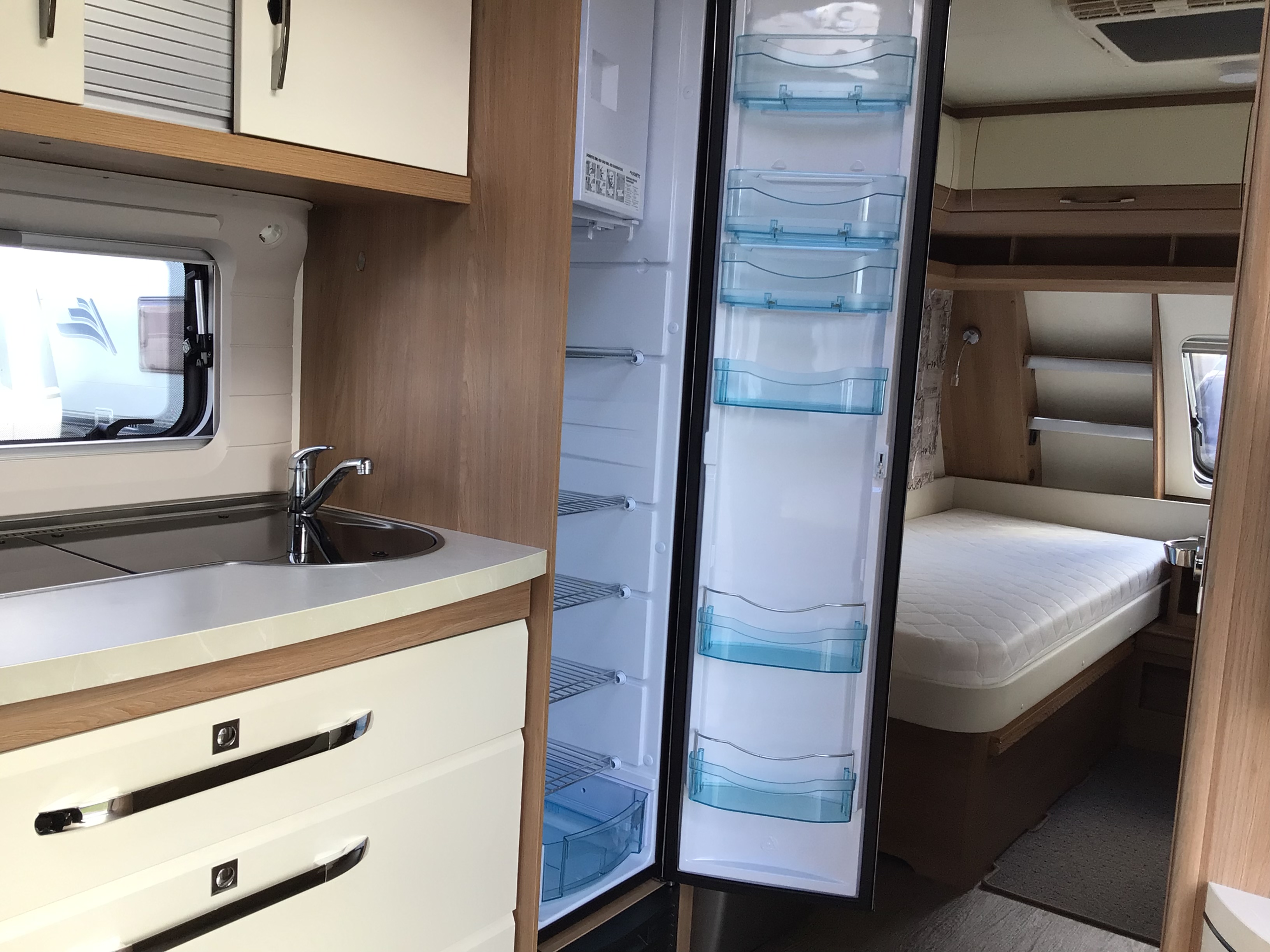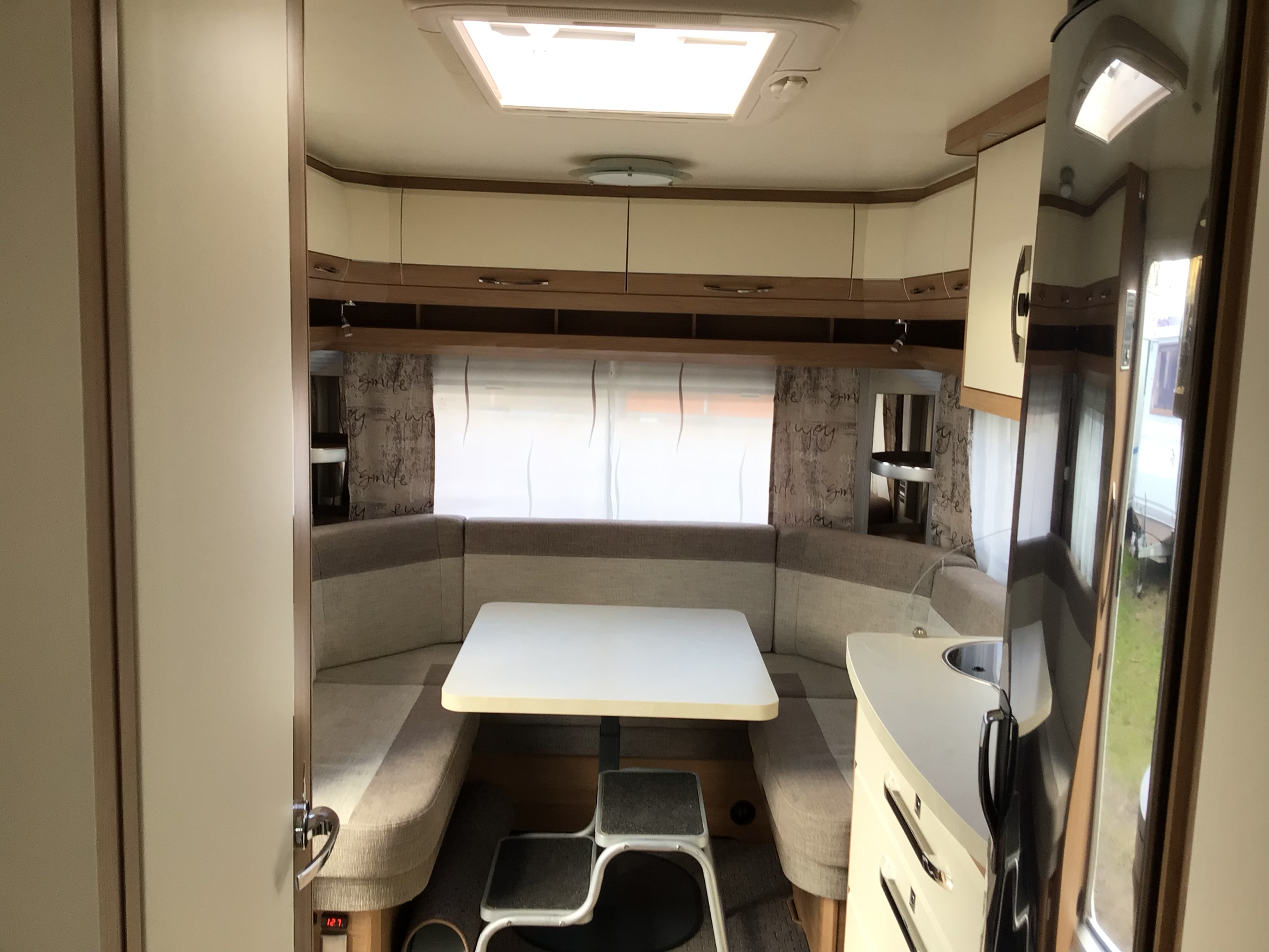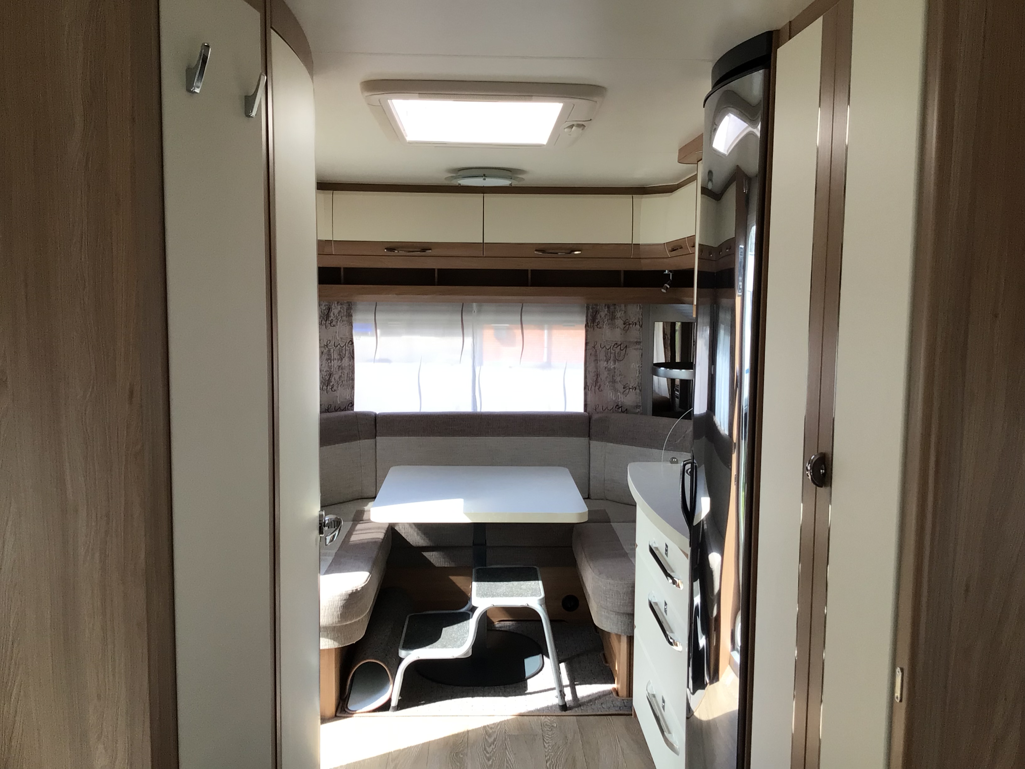 Fin lækker og velholdt Ene ejers vogn med Enkeltsenge med lamel udtræk i forenden og med stor rund siddegruppe bagerst i vognen, Midt i vognen fint køkken med højt Køleskab og toilet rum. stor 1800kg aksel, Quattro Fuldautomatisk mover, Dometic 2200 Aircon, 12v pakke, Frontmonteret cykelholder, kant syede tæpper.