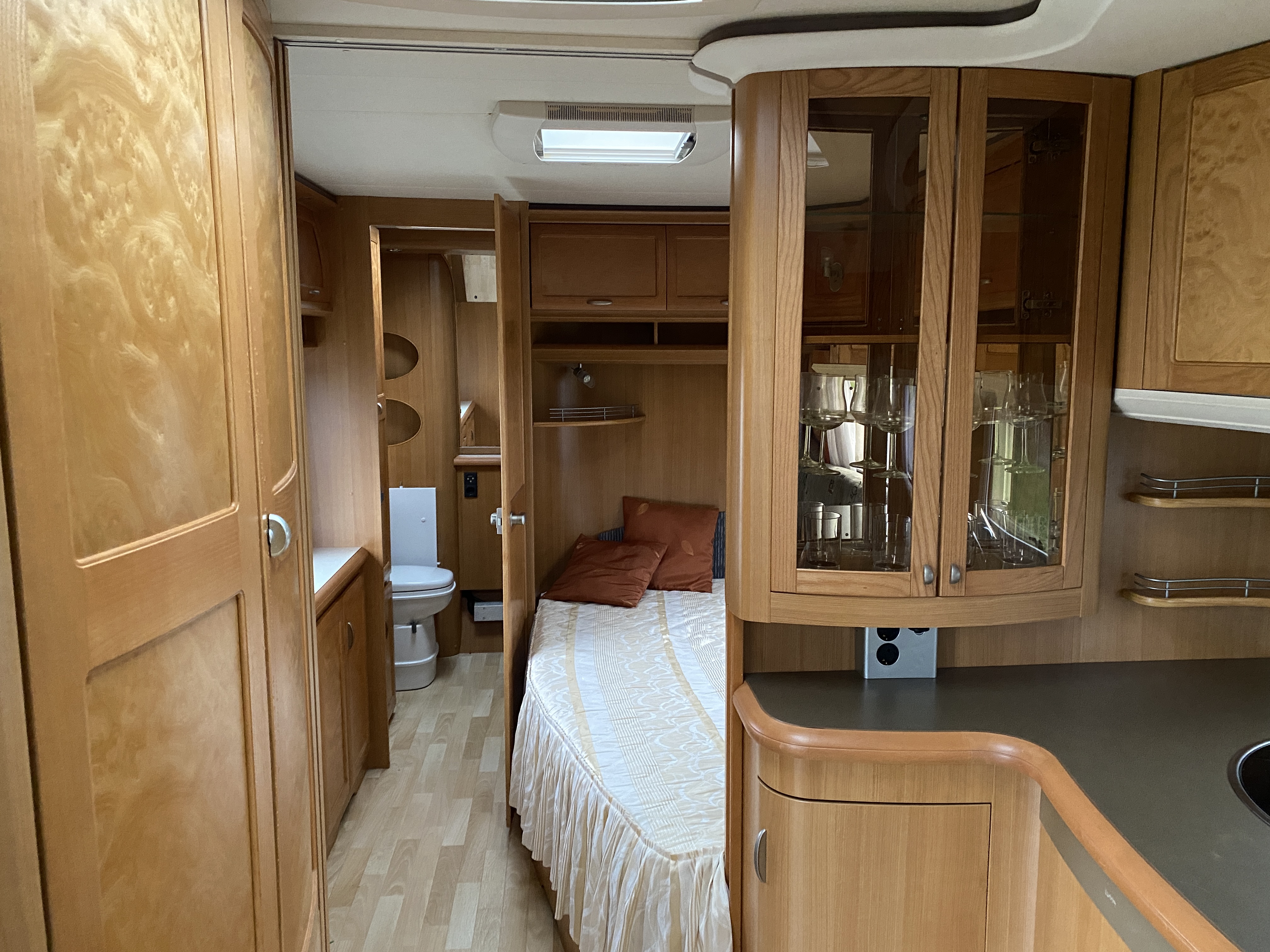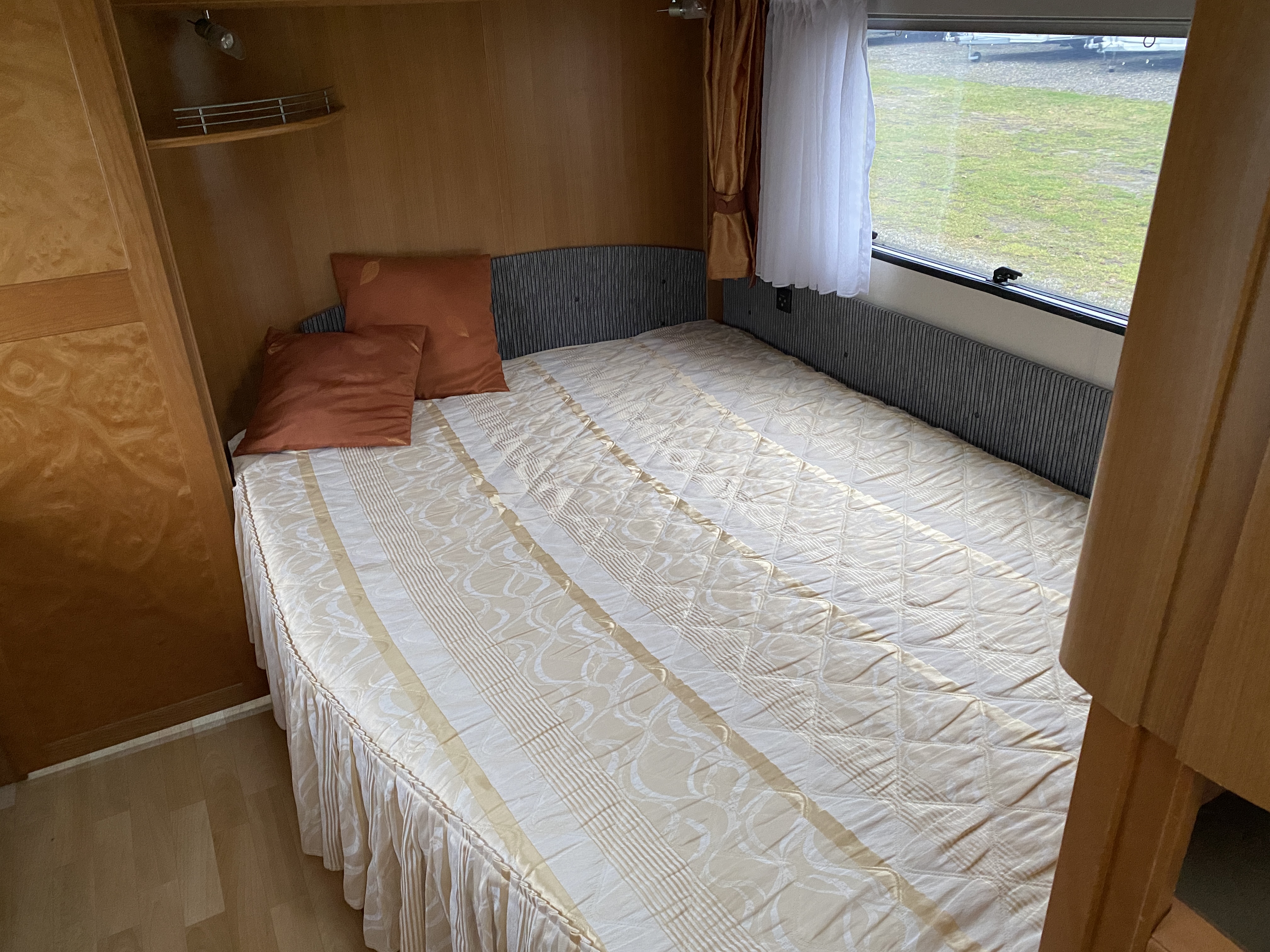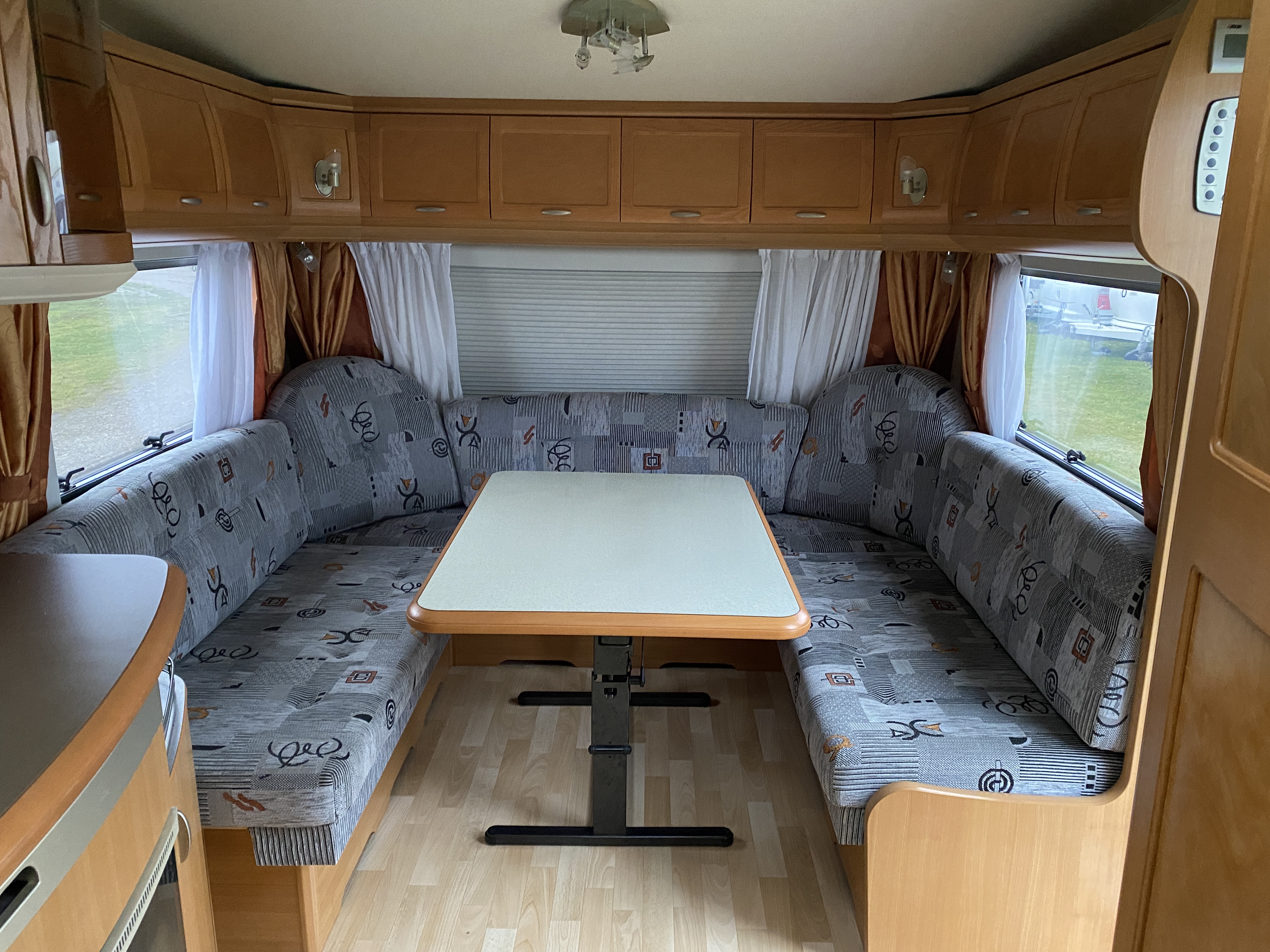 Dejlig og rummelig campingvogn med Alde centralvarme og Elektrisk gulvvarme, Stor rundsiddegruppe i forenden af vognen, midt i vognen er der stort Køkken og franskseng. I bagenden er der stort badeværelse. Vognen sælges synet, gastestet og med forhandler garanti.